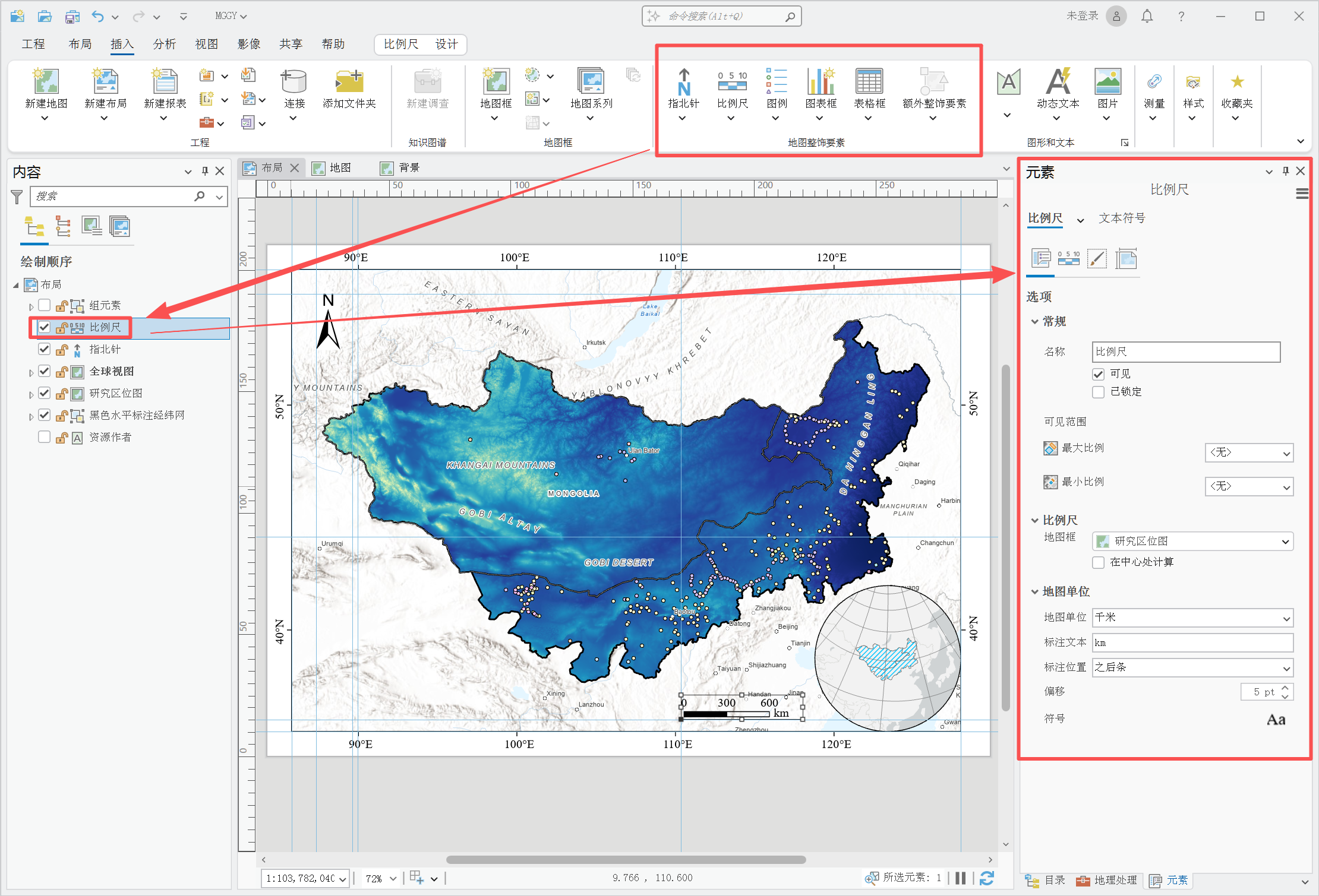 从“地图整饰要素”里添加指北针和比例尺,样式尽量简洁,避免装饰过重。通常这两个元素放在图面边缘位置,更不容易干扰主体。