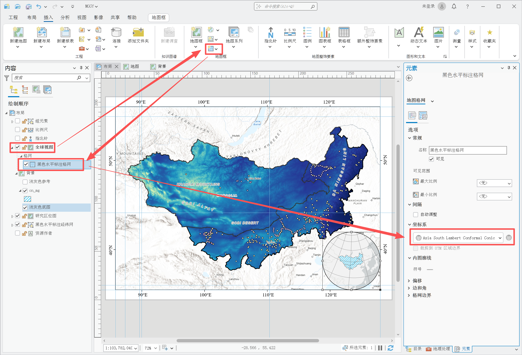 背景图也可以加格网,但要特别注意坐标系匹配。我的研究区位于蒙古高原,背景图格网坐标系设置为 Asia South Lambert Conformal Conic,显示效果更自然。